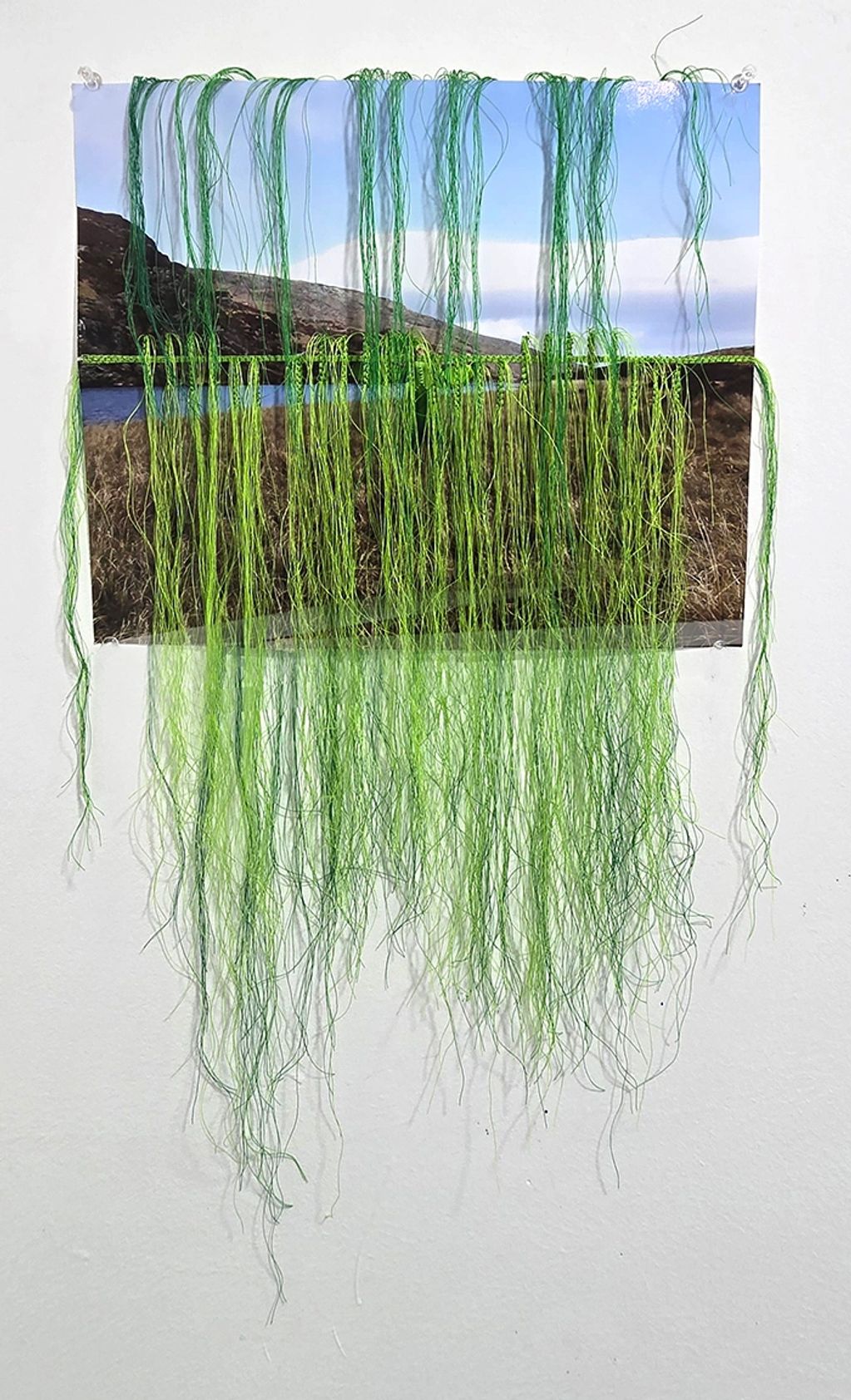 Performance image at Shrone Lake, netting, 'alone' sewn in Ogham into the photographic paper.